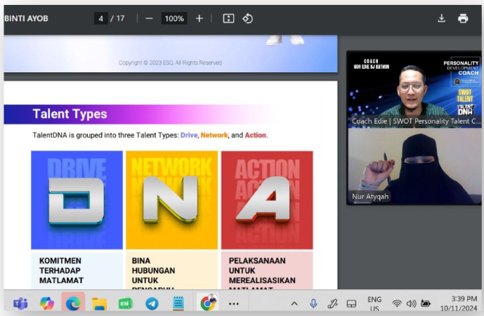 Saya mengambil kedua-dua slow SWOT Talent dan Talent DNA. Alhamdulillah saya sangat-sangat teruja dan merasakan potensi yang bagus atas kurniaan Allah untuk saya polish dan manfaatkan. Sebenarnya kita adalah insan yang Allah dah berikan segala kelebihan. Bersyukurlah dengan terus bertindak agar menjadi insan yang berkualiti dari segi kerjaya dan kehidupan.